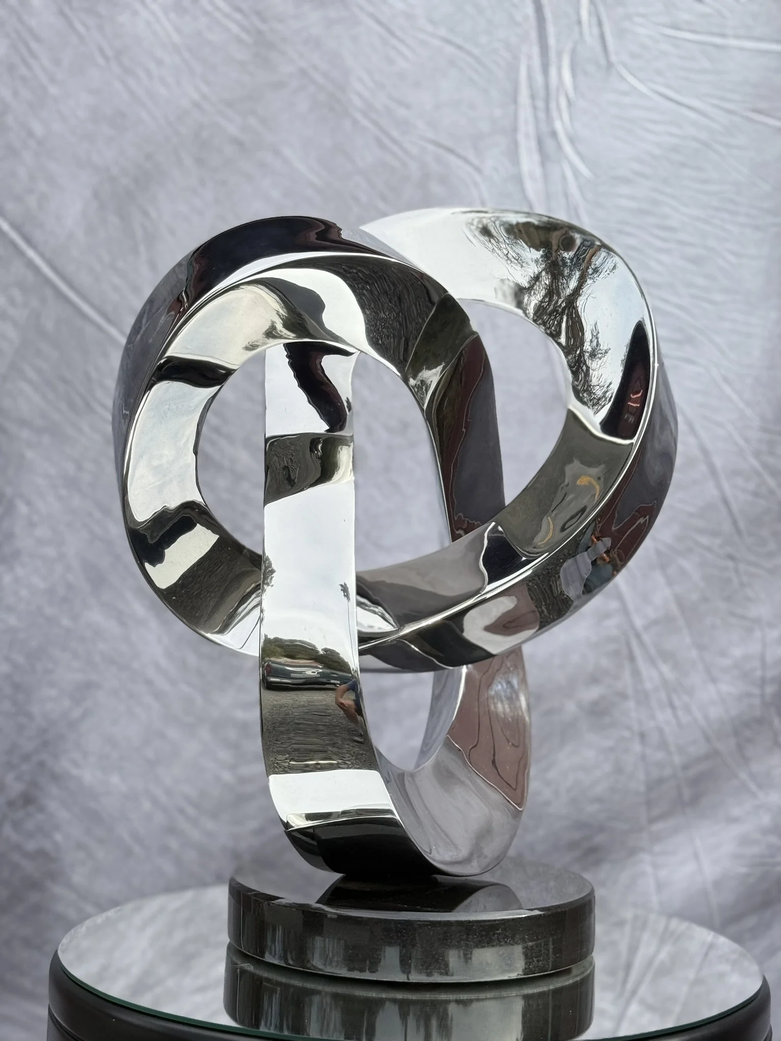 Circo is a trefoil Möbius sculpture now reimagined in gleaming stainless steel. The name—Italian for “circus” or “ring”—reflects both its continuous form and playful energy. Originally carved in calcite, the piece was later scanned and cast after the original was damaged. This new stainless edition brings a crisp, contemporary presence to the design. Its polished surface catches and bends light, amplifying every twist and curve. The form loops seamlessly, full of rhythm and tension, like a performer in motion.